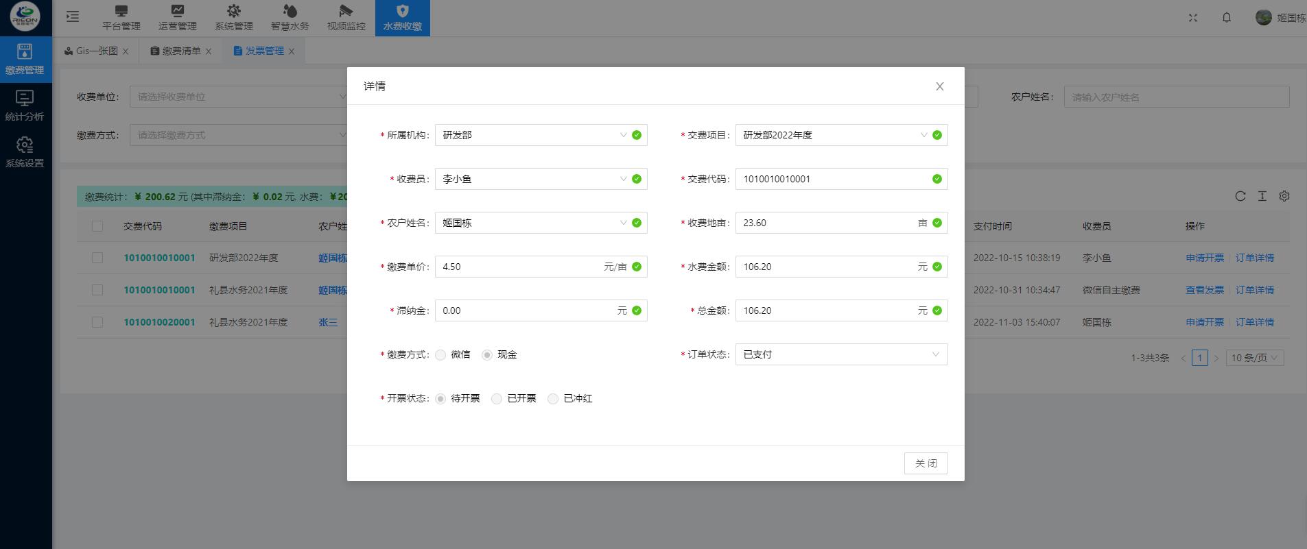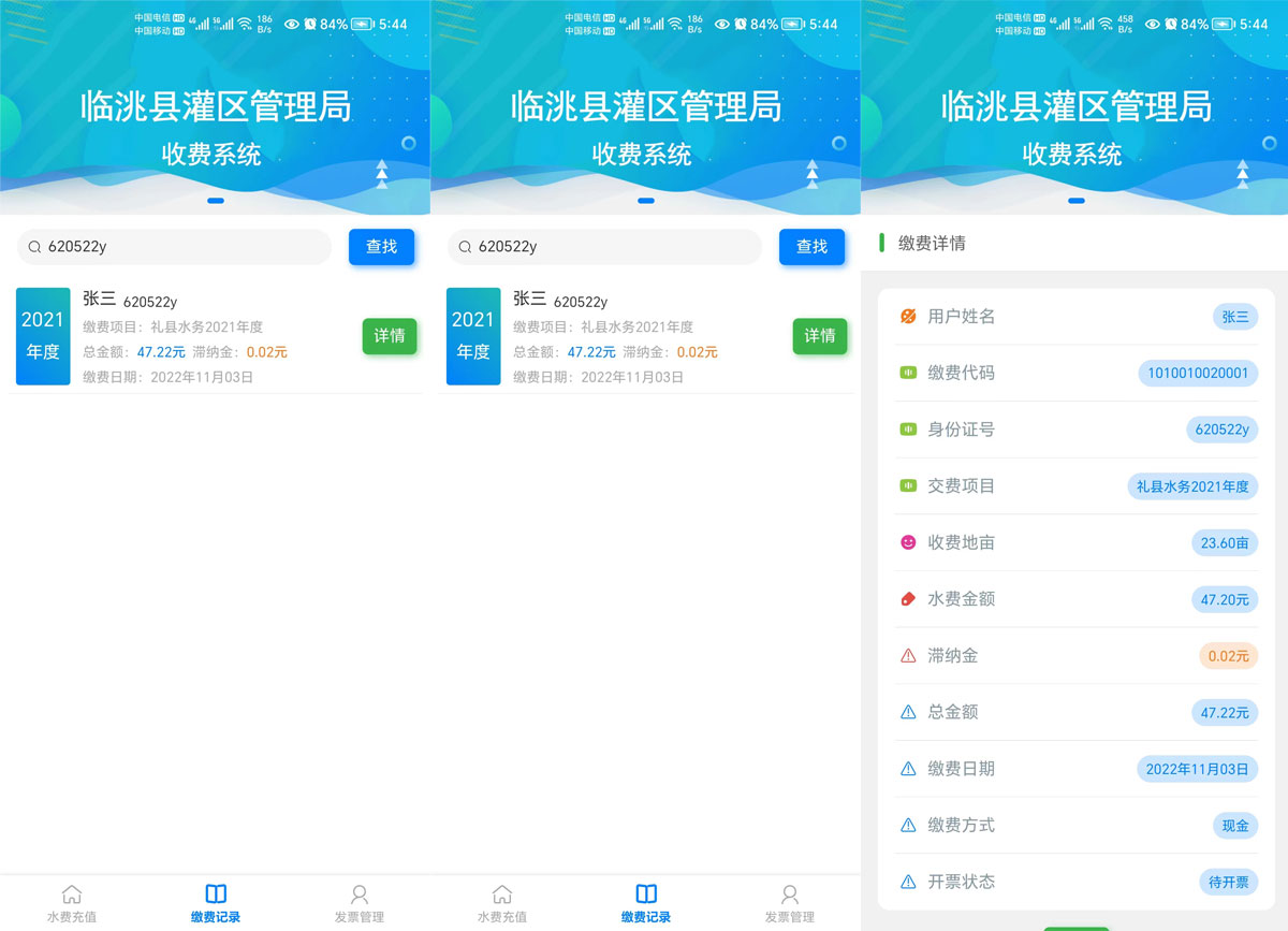 灌區(qū)收費系統(tǒng)運用計算機應用技術以及相關的專用分析軟件和通訊網絡所組成的一個綜合性的收費系統(tǒng)。通過對流經用水戶的灌溉 時間以及流量的輸入,計算出該用水戶的水費,生成收費賬單提交至上級審核 ,審核通過即可在線繳費以及他人代繳功能。管理單位可以在手機和電腦網頁上同步查詢相應的用水量以及繳費情況。